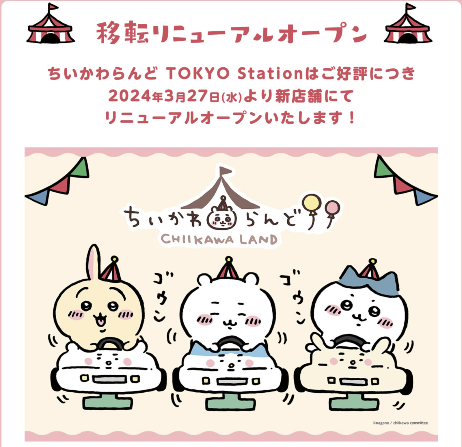東京駅一地番街にあるちいかわのオフィシャルショップ、「ちいかわらんど TOKYO Station」が2024年3月27日にリニューアルオープン。