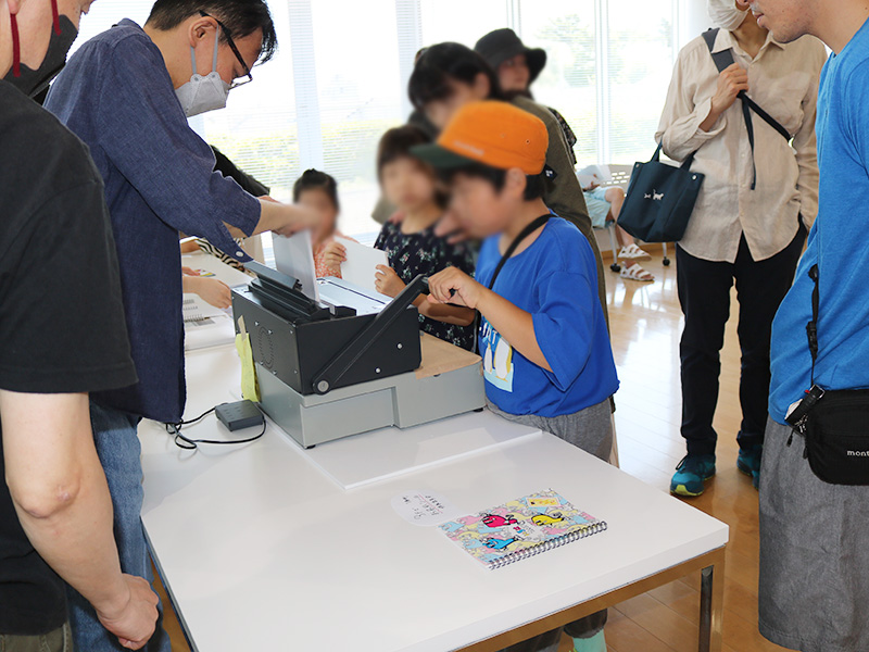 印刷された名刺は、隣の部屋にある大きなカッティングマシーンでそのままカット実演を行ったりと、大きな機械が動く様子にみなさん興味津々でした!