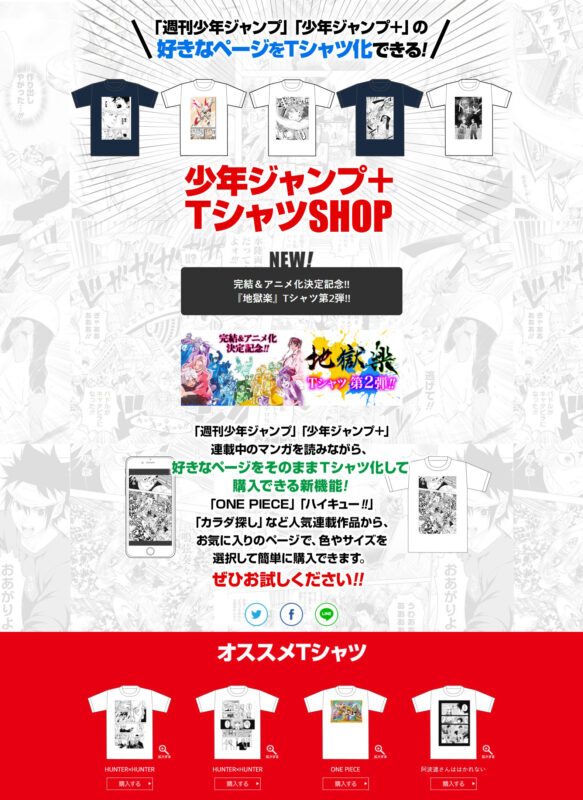 集英社の「週間少年ジャンプ」編集部が運営する「週刊少年ジャンプ+」は漫画を読みながら、好きなページを選んでTシャツにできる、オーダーメイドTシャツ製造のサービスです。