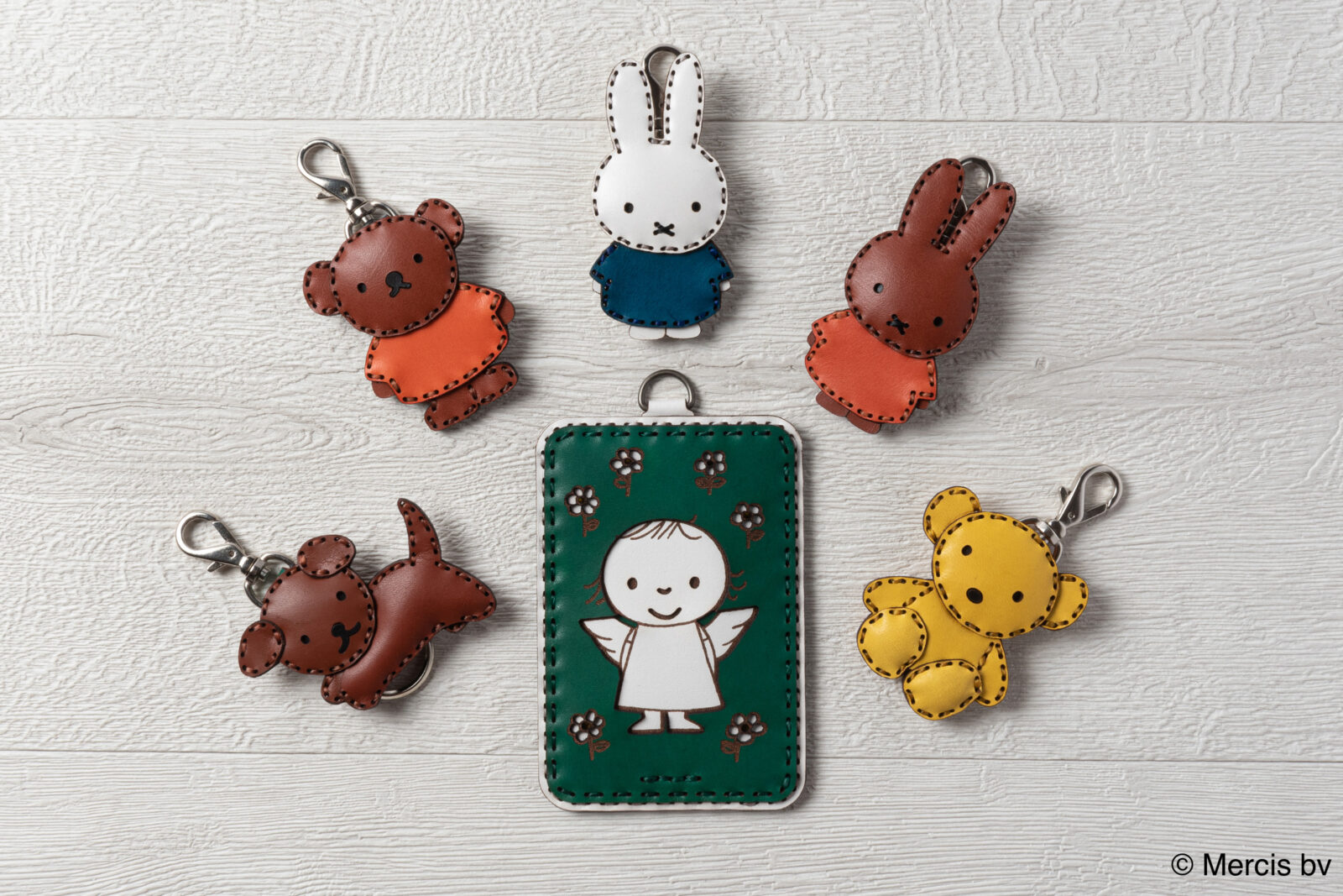 「ミッフィー」「メラニー」「ボリス」「スナッフィー」「くまのぬいぐるみ」、それぞれの全身をデザインした、ぷっくりタイプのレザーキーホルダーに、「てんし」のカードケースをラインナップ。