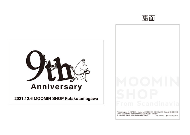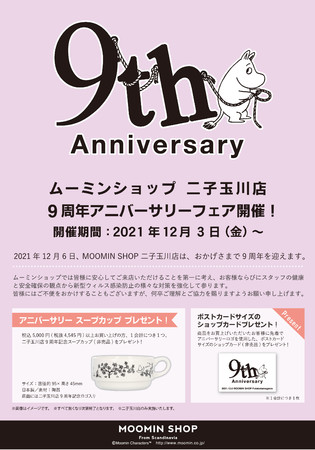 「MOOMIN SHOP」1号店となる二子玉川店の9周年を記念して、2021年12月3日(金)よりお買い上げ特典として9周年アニバーサリーロゴデザインのポストカードサイズの「ショップカード」(非売品)や、オリジナルデザインの「二子玉川店9周年記念スープカップ」(非売品)をプレゼントいたします。また、店頭には新商品も登場し、9周年を盛り上げます。