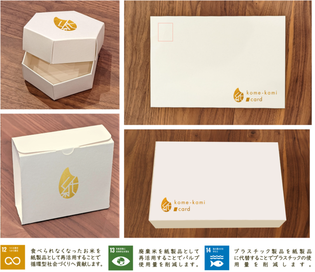 「kome-kami」は破棄予定のお米や食用ではなくなってしまったお米を再利用して、フードロス問題の解決を目標とし、売上の1%をフードバンクに寄付しています。