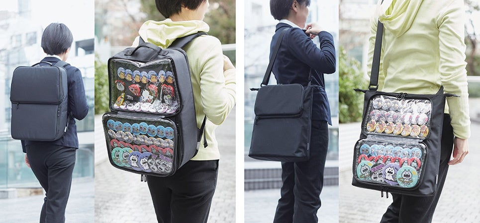 可動式の透明窓構造により、“お仕事モード” と “推しごとモード”を切り替えることができます。透明窓を展開することで、バッジやキーホルダーなどを全面に推しだすことができ、大好きな“推し”と、いつも一緒にいられます。バックパックのメイン気室内部には、クッションを内蔵したスリーブポケットを備えており、15.6インチまでのノートパソコンや、A4サイズの冊子なども収納可能です。ショルダートートバッグはショルダーベルトの長さを調節することで、トートスタイルとメッセンジャースタイルの切り替えが可能な2Way仕様です。