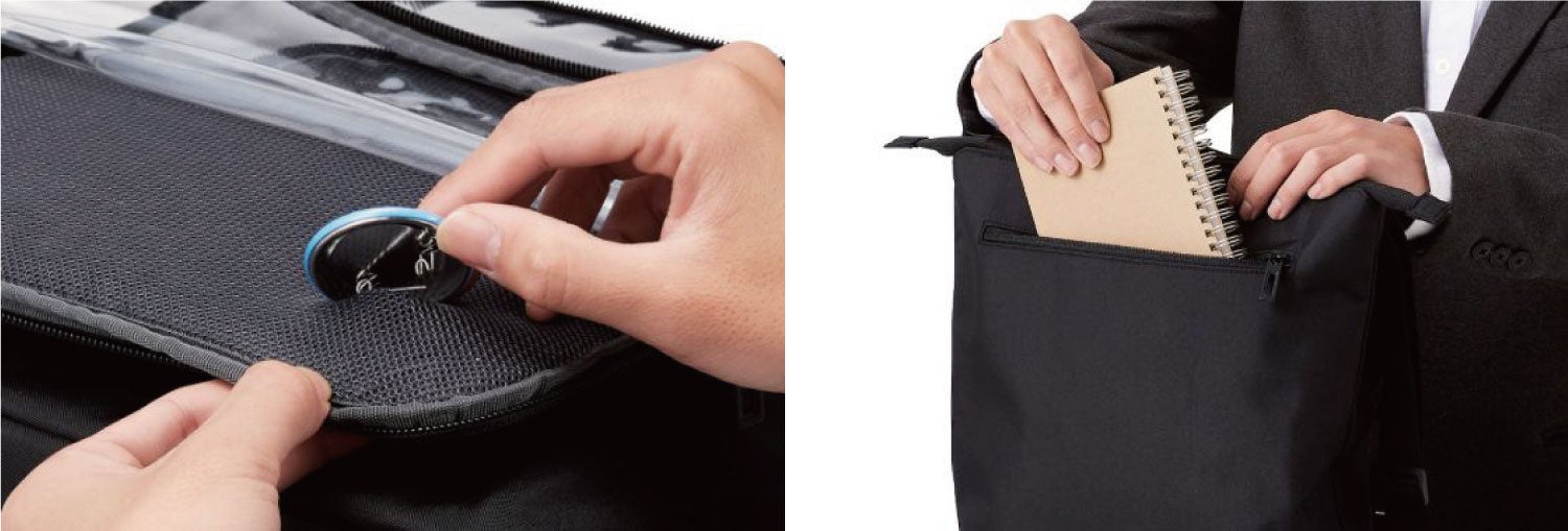 グッズを取り付ける部位にはメッシュ生地を採用しており、バッジやストラップを簡単に取り付けることが可能です。ショルダーベルトの長さを調節することで、トートスタイルとメッセンジャースタイルの切り替えが可能です。バッグ背面には、簡単に荷物の出し入れができる汎用ファスナーポケットを備えています。バッグ底面に搭載された硬質芯材が、収納物によるバッグの変形を軽減します。メイン気室内部は、A4サイズの書類の収納に対応しています。