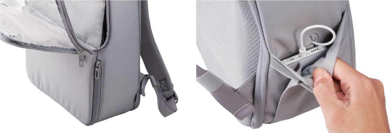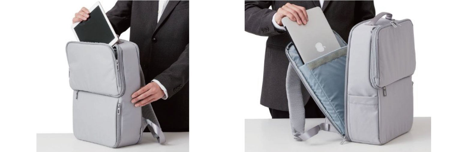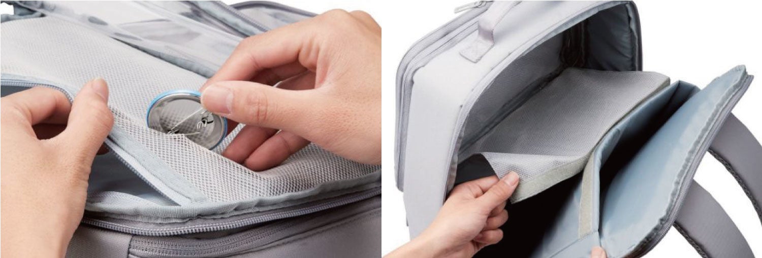 グッズを取り付ける部位にはメッシュ生地を採用しており、バッジやストラップを簡単に取り付けることが可能です。メイン気室内部のメッシュフラップとクッションポケット上部の面ファスナー同士を接着することで、簡易的な2気室構造となり、ぬいぐるみなど厚みのあるものも配置可能です。バッグ前面には、前抱えの際にも簡単に取り出すことができ、汎用的に使えるファスナーポケットを備えています。バッグ側面には、荷物の出し入れがしやすいよう、伸縮スリーブポケットを備えています。ポケット内にはコードホールが付いています。バッグ側面には、リュックを半分下ろした状態や背負ったままの状態でも荷物の出し入れがしやすいよう、サイドファスナーポケットを備えています。財布等の出し入れに便利です。メイン気室内部には、クッションを内蔵したスリーブポケットを備えています。15.6インチまでのノートパソコンや、A4サイズの冊子なども収納可能です。