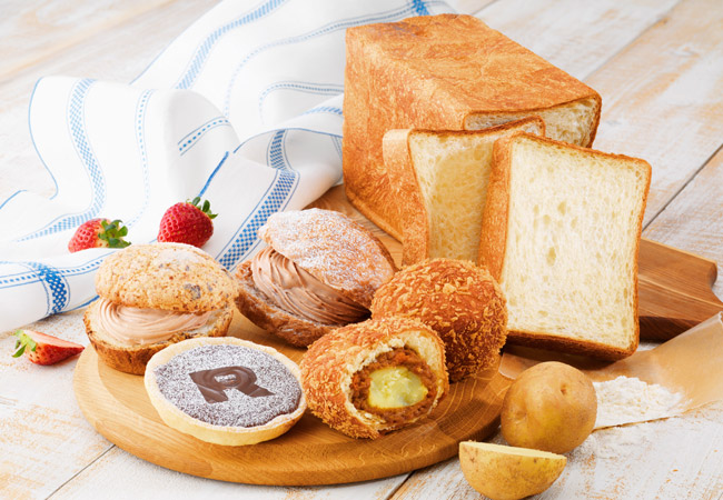 新設されたベーカリーコーナーでは、約50種類のパンを販売しています。その大半がふと美工場直売店限定の味わいで、“北海道の素材にこだわったパン”、カカオニブやココアバターなどの素材やチョコレートを使った“カカオ&チョコレートのパン”、“世界で親しまれているパン”それぞれのコンセプトをもとにつくりました。他のロイズ直営店にあるロイズベーカリーで人気のパンも一部販売しています。