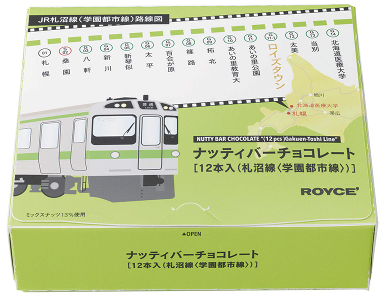 ロイズタウン駅を含むJR札沼線(学園都市線)の駅名とその路線を走る電車をデザインしたパッケージに、ナッツの魅力をぎっしり詰めこんだ、重厚感と香ばしさが感じられるチョコレートバー「ナッティバーチョコレート」を入れました。
