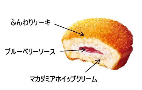 - ハワイのパンケーキの味わいをイメージし、マカダミアホイップクリームとブルーベリーソースをふわふわ食感のケーキに閉じ込めました。マカダミアを使用したマカダミアホイップクリームと、酸味のあるブルーベリーソースとの組み合わせが楽しめます。