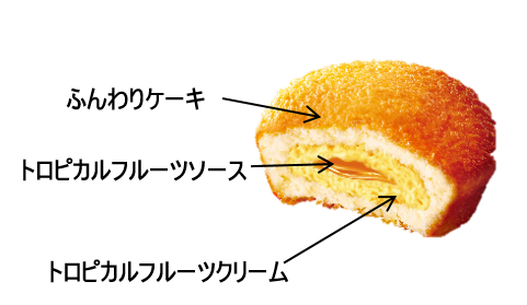 - ハワイのパンケーキの味わいをイメージし、トロピカルフルーツクリームとトロピカルフルーツソースをふわふわ食感のケーキで閉じ込めました。華やかな味わいのトロピカルフルーツクリームと酸味のあるトロピカルフルーツソースの組み合わせが楽しめます。
