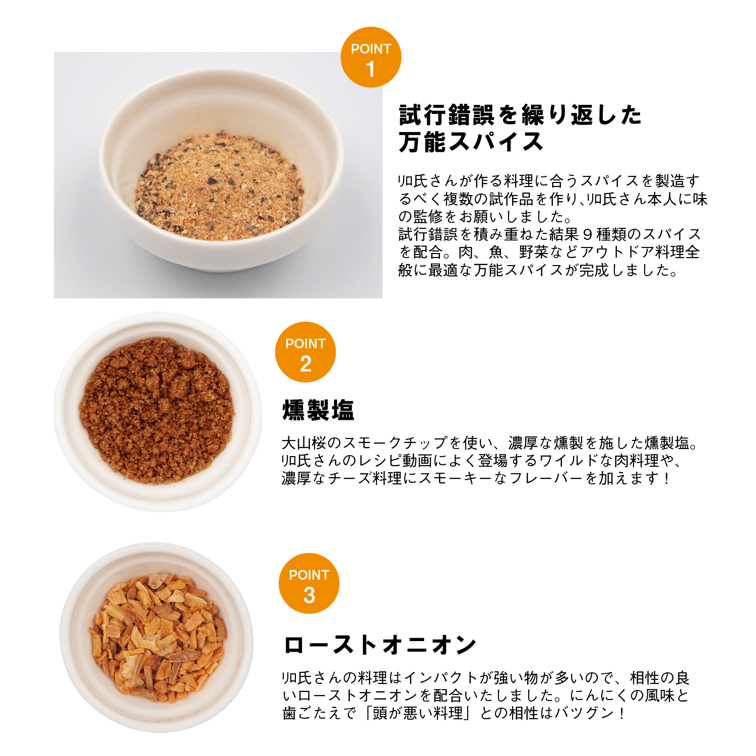 リロ氏さんの料理はインパクトが強い物が多いので、相性の良いローストオニオンを配合いたしました。にんにくの風味と歯ごたえで「頭が悪い料理」との相性はバツグン!