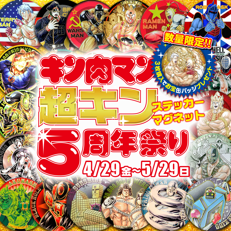 超キン関連商品3枚ご購入で76mmの墓場の画廊限定特典「スグル&テリーマンのマシンガンズ」缶バッジをプレゼント。