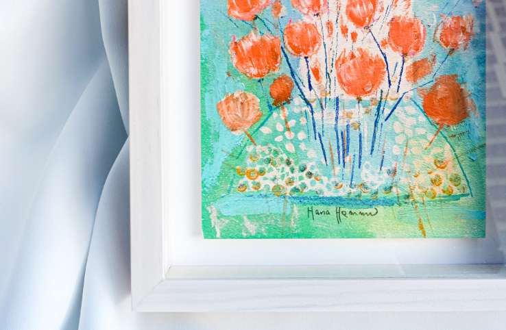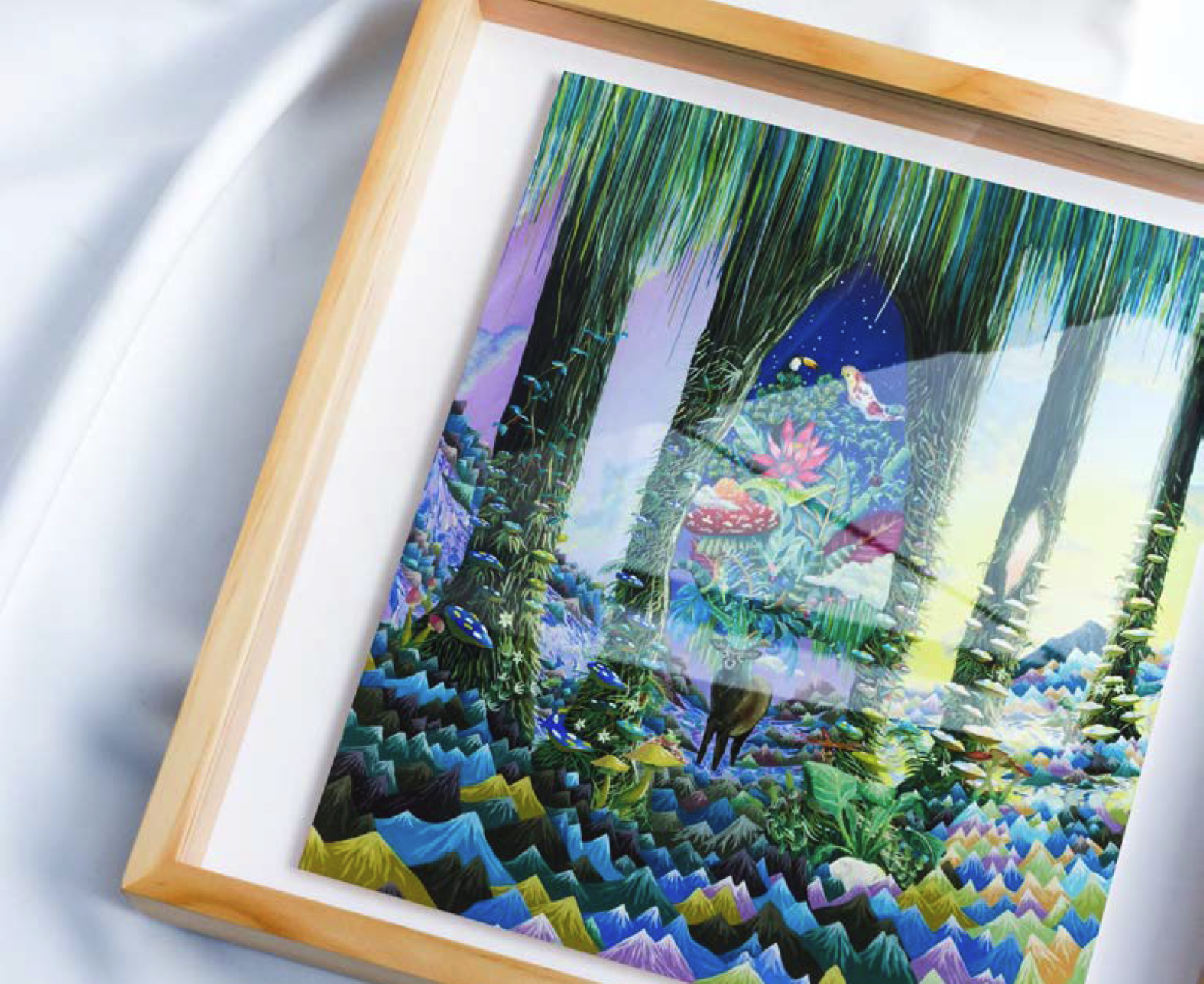 額装は、マットでなめらかな無垢材を用いた額縁に、作品を引き立てる浮かしの技法によるセッティングを採用。インテリアとも馴染みやすく、特別でありながら普段の生活の中で楽しんでもらえるようにデザインされています。