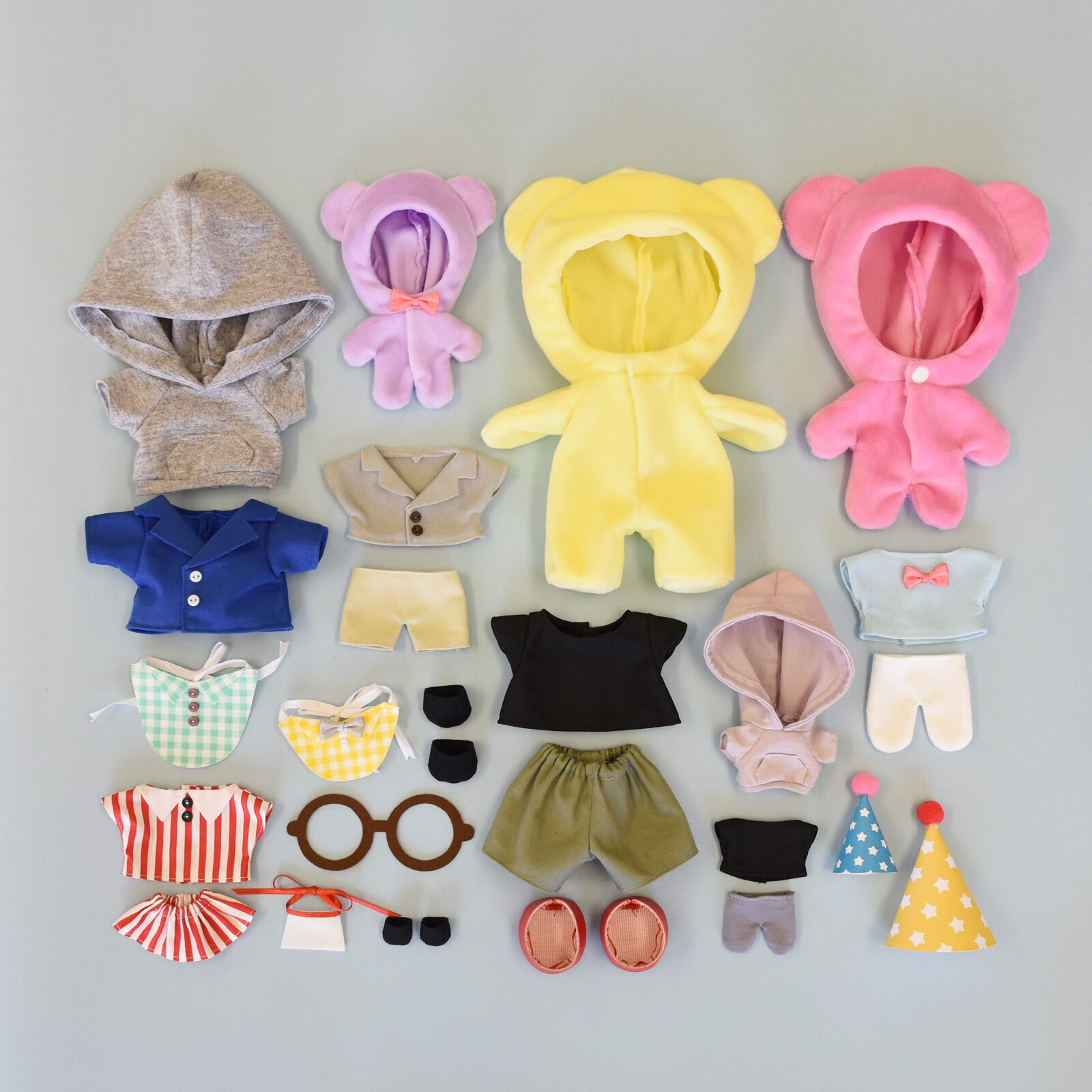 お洋服も手作りできるので、着せ替えもお楽しみいただけます。Tシャツ、パンツ、タイツ、スカート、ジャケット、フーディー、きぐるみの7種類のお洋服+くつをご紹介! すべてに型紙がついています。