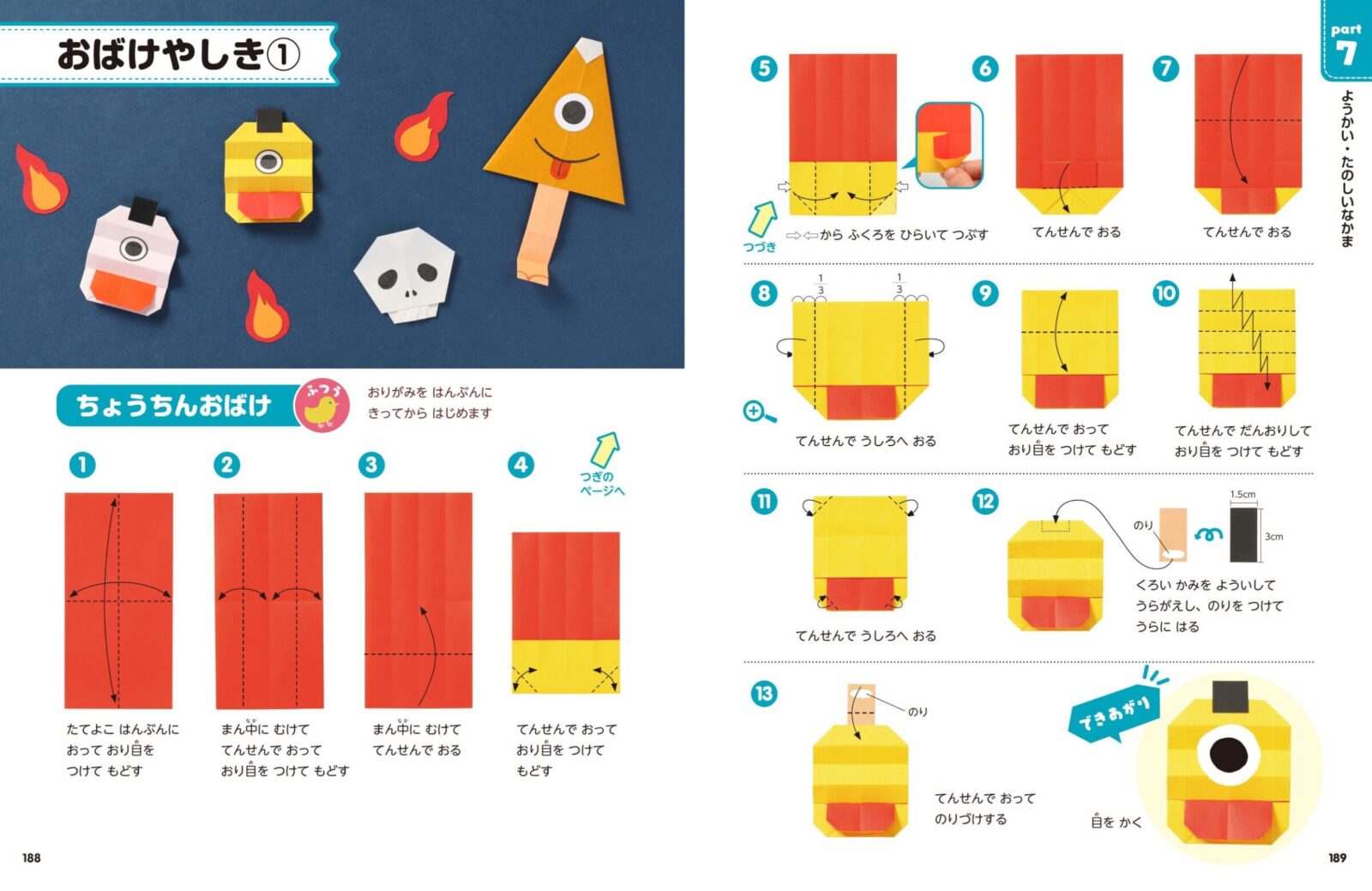 たとえば、「ベロを出したちょうちんおばけ(妖怪)」はなんと、ベロの部分まで1枚で折れます。父の日にプレゼントしたい「ネクタイハート」は、ハートがネクタイをつけているという斬新なデザインで、これも1枚折り。折っていく途中で、この部分がベロになるのか、ネクタイになるのか、と感動するポイントに出会えます。