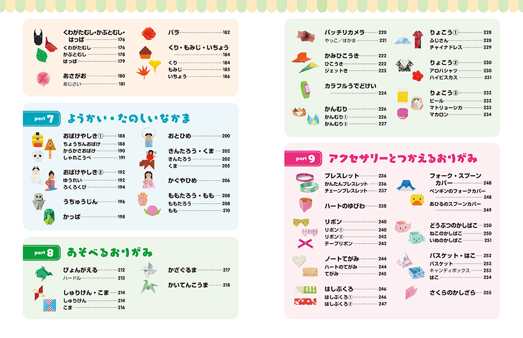 全部で9章ある大ボリュームながら、写真付きの目次で、折りたい作品が探しやすくなっています。