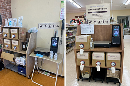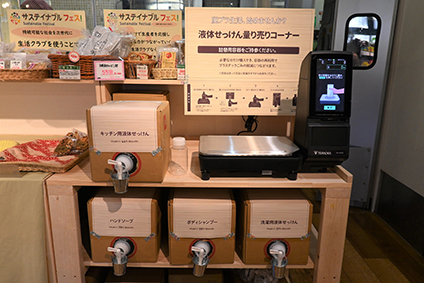 今回の取組みは、ハンドソープ、ボディシャンプー、キッチン用液体石けん、洗濯用液体石けんの4品目の量り売りです。持参した容器に液体を詰め、計量器で測って精算というシンプルな方法です。