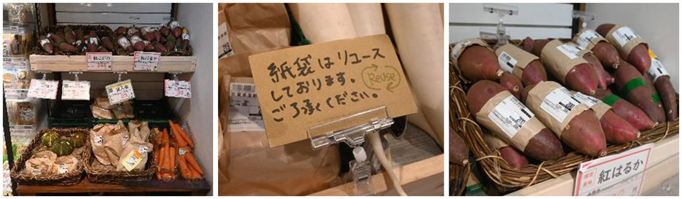 野菜はバラ売り&紙包装にシフト。紙袋も回収して繰り返し使っています。