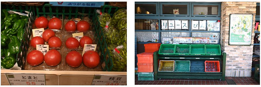 写真左:店舗外のリユースびん回収コーナー