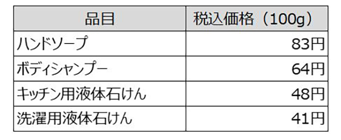 今回の取組みで量り売りするのは、ハンドソープ、ボディシャンプー、キッチン用液体石けん、洗濯用液体石けんの4品目です。持参した容器に液体を詰め、計量器で測って精算というシンプルな方法です。