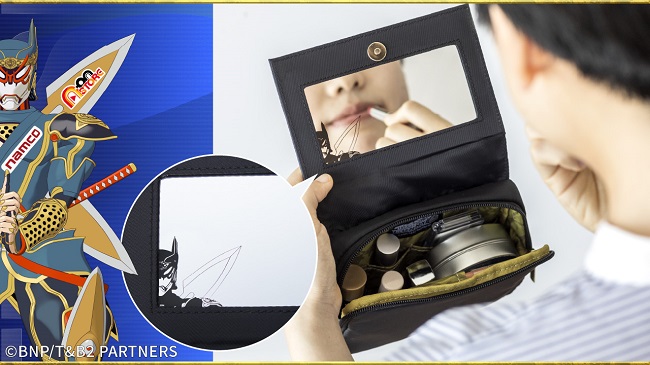 サッと身だしなみを確認できるミラーには、見切れ職人「折紙サイクロン」が見切れています。ふたが、がばっと開く構造で、鏡を見ながらでも片手で中身が取り出しやすいのがポイントです。内生地は中身が確認しやすい明るい色に、ワイルドタイガーとバーナビー・ブルックス Jr.のシルエットが総柄でデザインされています。