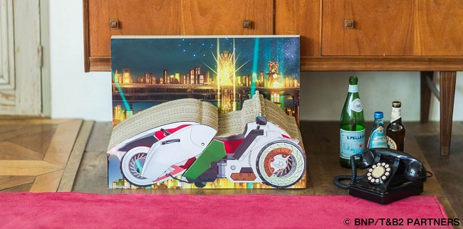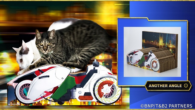 アニメ『TIGER & BUNNY 2』に登場するヒーロー、ワイルドタイガーとバーナビー・ブルックス Jr.が乗っているバイク「ダブルチェイサー」を模した猫用のつめとぎです。ワイルドタイガーのバイクがサイドカーになっている状態が、段ボールを重ね合わせた台座になっている設計です。背景はシュテルンビルトの夜景で、シュテルンビルトを疾走しているかのようなつめとぎシーンを楽しめます。