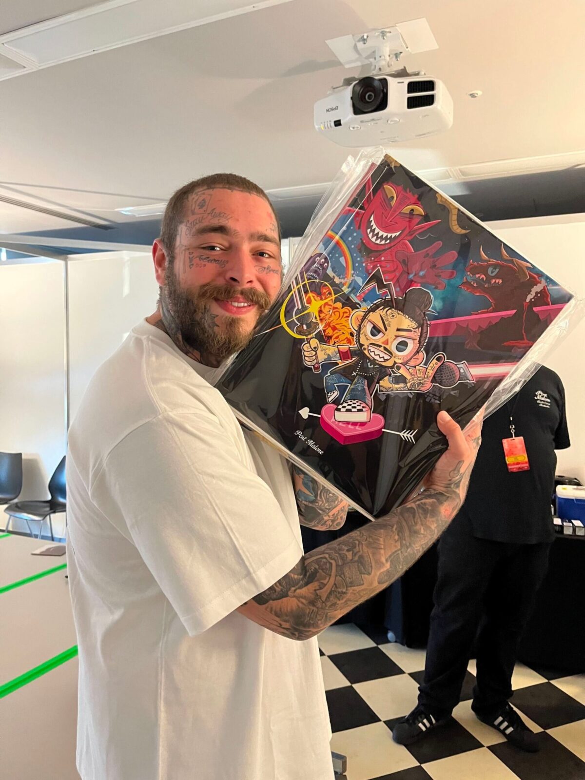 ※サマーソニック2022で来日したポスト・マローン氏が、優秀作品のキャンバスアートを受け取った様子。