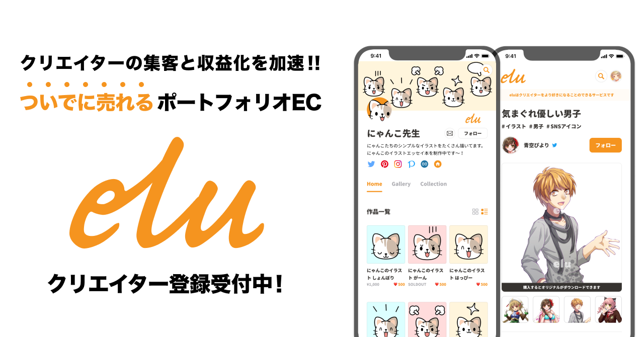 eluはイラストレーター、漫画家、アーティスト、声優など、様々なジャンルのクリエイターが簡単に自分の作品を掲載、販売できる「ポートフォリオEC」サービスです。クリエイターの認知度拡大や収益化のサポートをいたします。