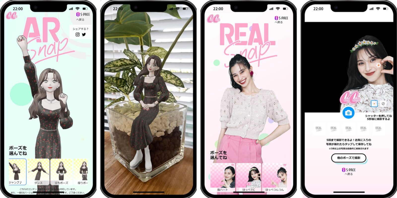 ・「CanCam」専属モデルの中条あやみさんのアバターをARでリアルな空間に表示して撮影できる「AR Snap」や、リアルな中条さんと一緒にY2Kテイストの写真が撮れる「Real Snap」コーナーを公開。