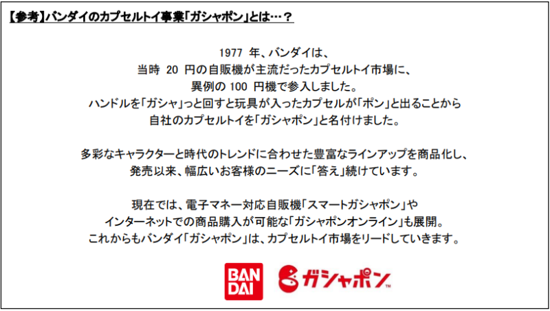 株式会社バンダイ ベンダー事業部(本社:東京都台東区)が「ガシャポン」のブランドで展開しているカプセルト イ事業は、皆さまに支えられ、2022 年で 45 周年を迎えました。現在、ガシャポン 45 周年プロジェクト「答えはガシャポンだ」を展開しています。