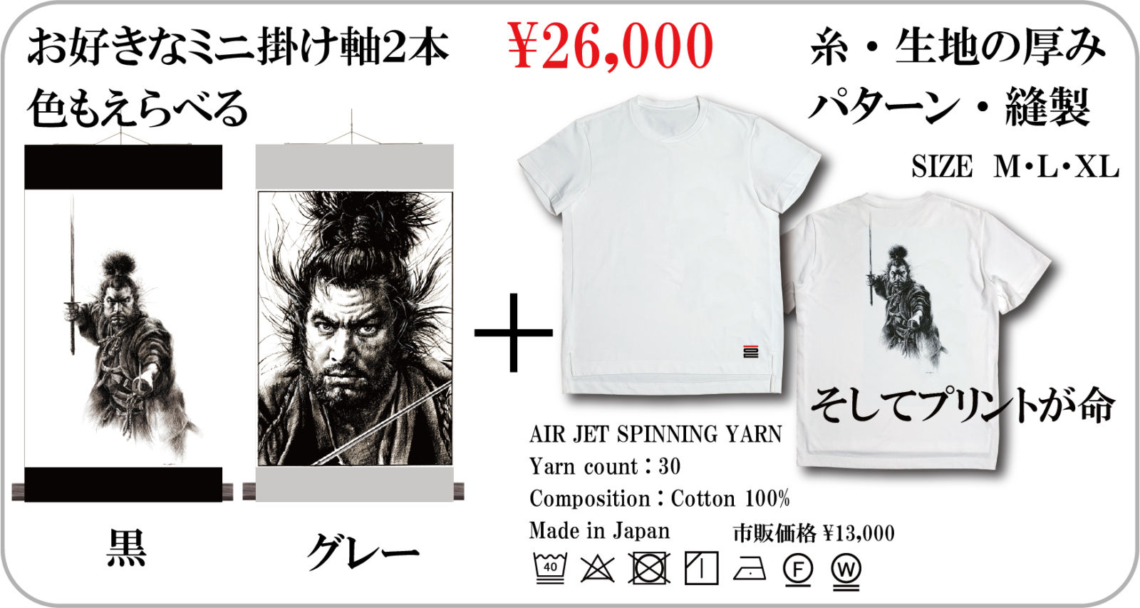 その名を広げる為に、イベント展⽰に使⽤する複製画として掛け軸を開発。 その理由としては、額装の複製画とは⼀線を引いた⽇本の『おもてなし⽂化』から。⽇本の伝統⼯芸で魅せる事で共に⽇ 本国内そして世界へ向けて発信する為。