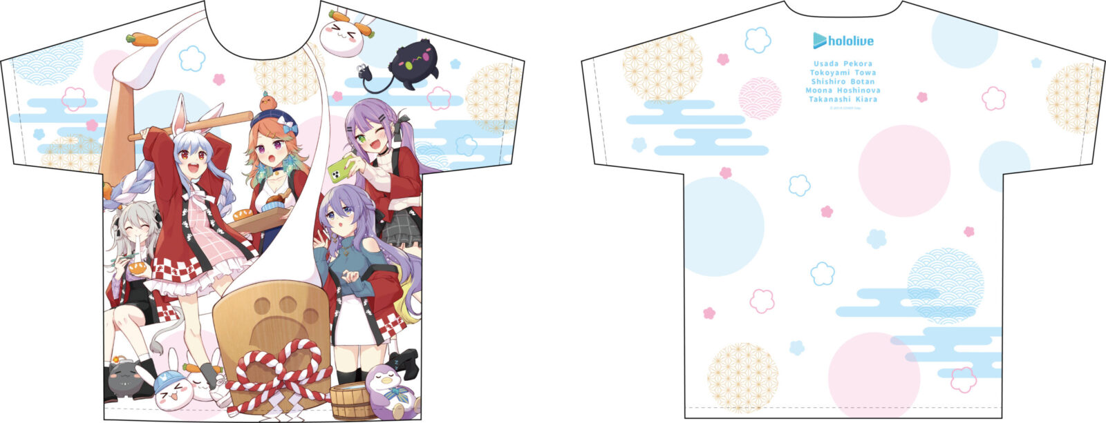 絵柄は「兎田ぺこら」、「不知火フレア」、「白銀ノエル」、「宝鐘マリン」それぞれの、うさぎをモチーフに描き下ろしたイラストや、「兎田ぺこら」、「常闇トワ」、「獅白ぼたん」、「ムーナ・ホシノヴァ」、「小鳥遊キアラ」が餅つきをするイラストとなっておりますので、ぜひご注目ください。