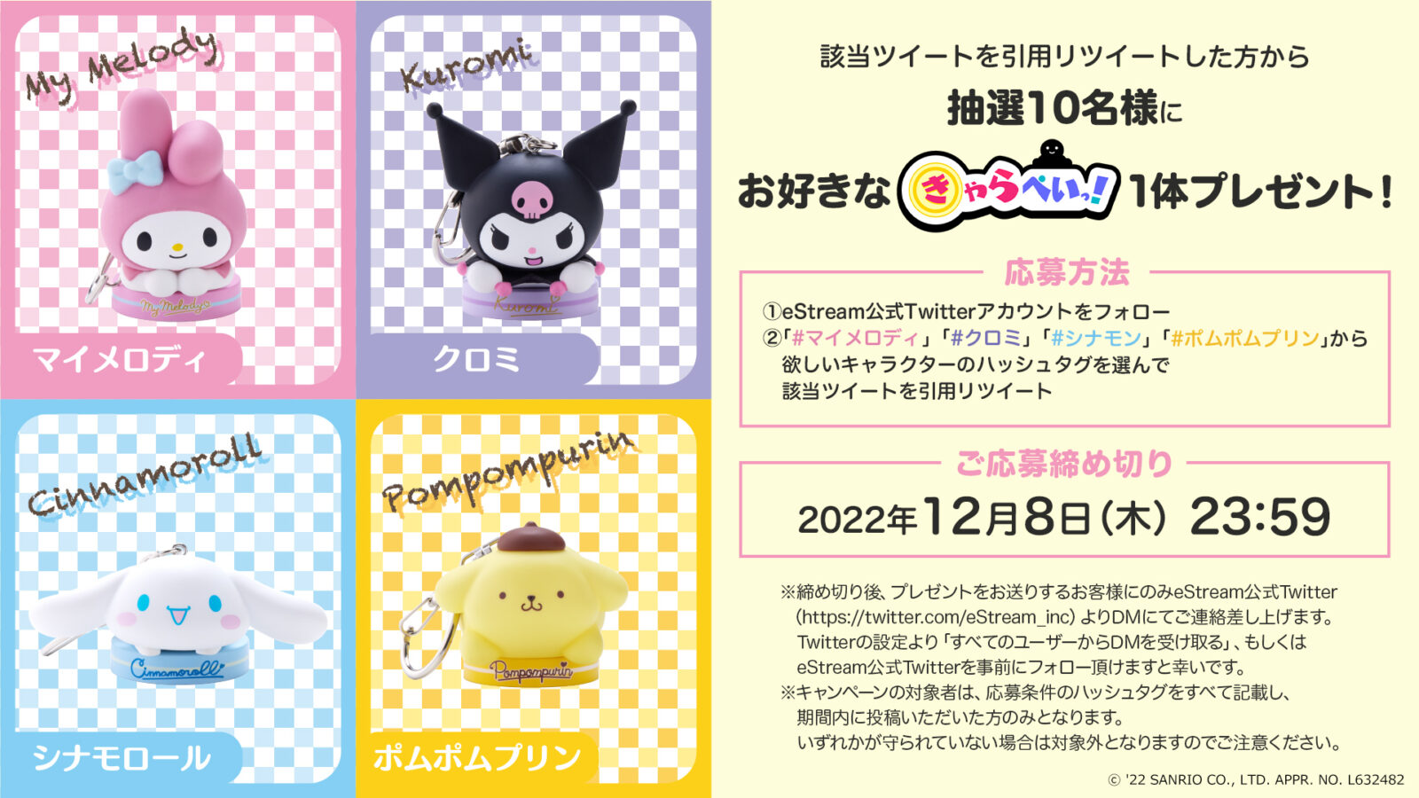 株式会社CyberZ(本社:東京都渋谷区、代表取締役社長:山内隆裕)の連結子会社、株式会社eStream(本社:東京都渋谷区、代表取締役社長:高井里菜)が手掛ける、コンビニなどで支払いに使えるキーホルダータイプのフィギュアブランド『きゃらぺいっ!』より、株式会社サンリオの人気キャラクターが登場し、本日11月17日(木)より販売開始いたします。