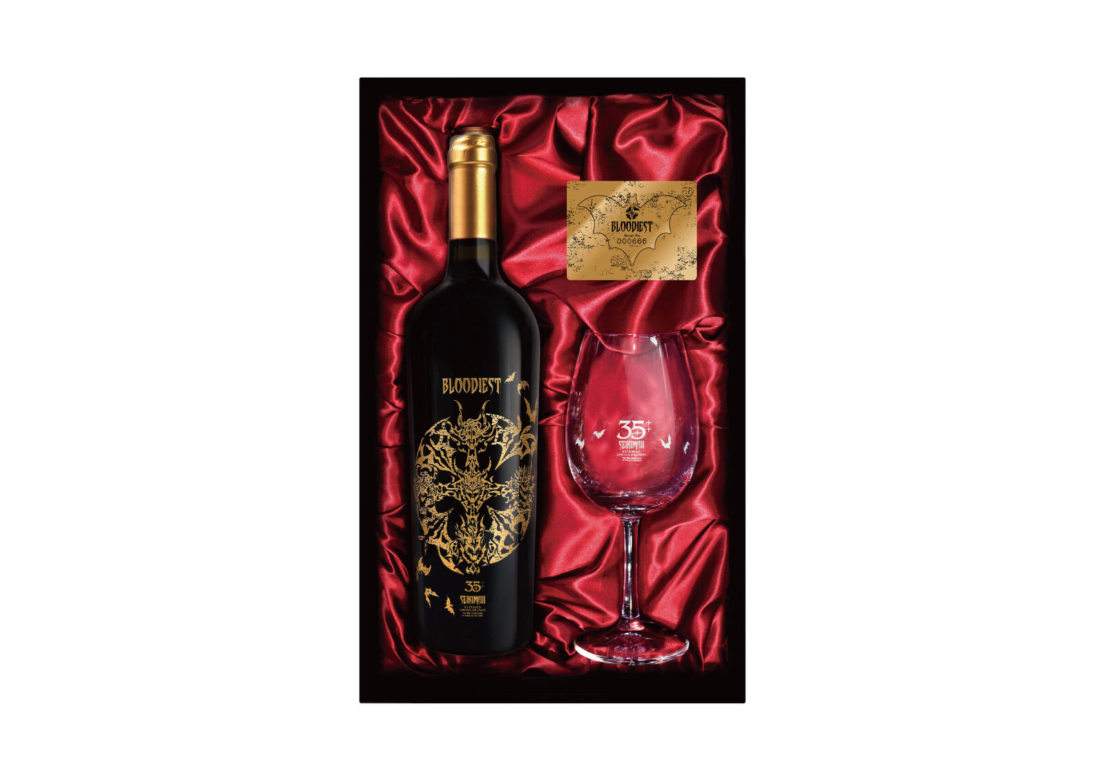 この商品は、ドラキュラ伯爵誕生の地であるルーマニアの赤ワイン「フェテアスカ・ネアグラ(漆黒の乙女)」を使用した赤ワインと、蝙蝠や35周年のロゴがプリントされたワイングラス、そして棺桶を想起させる豪華な化粧箱のセットとなっています。