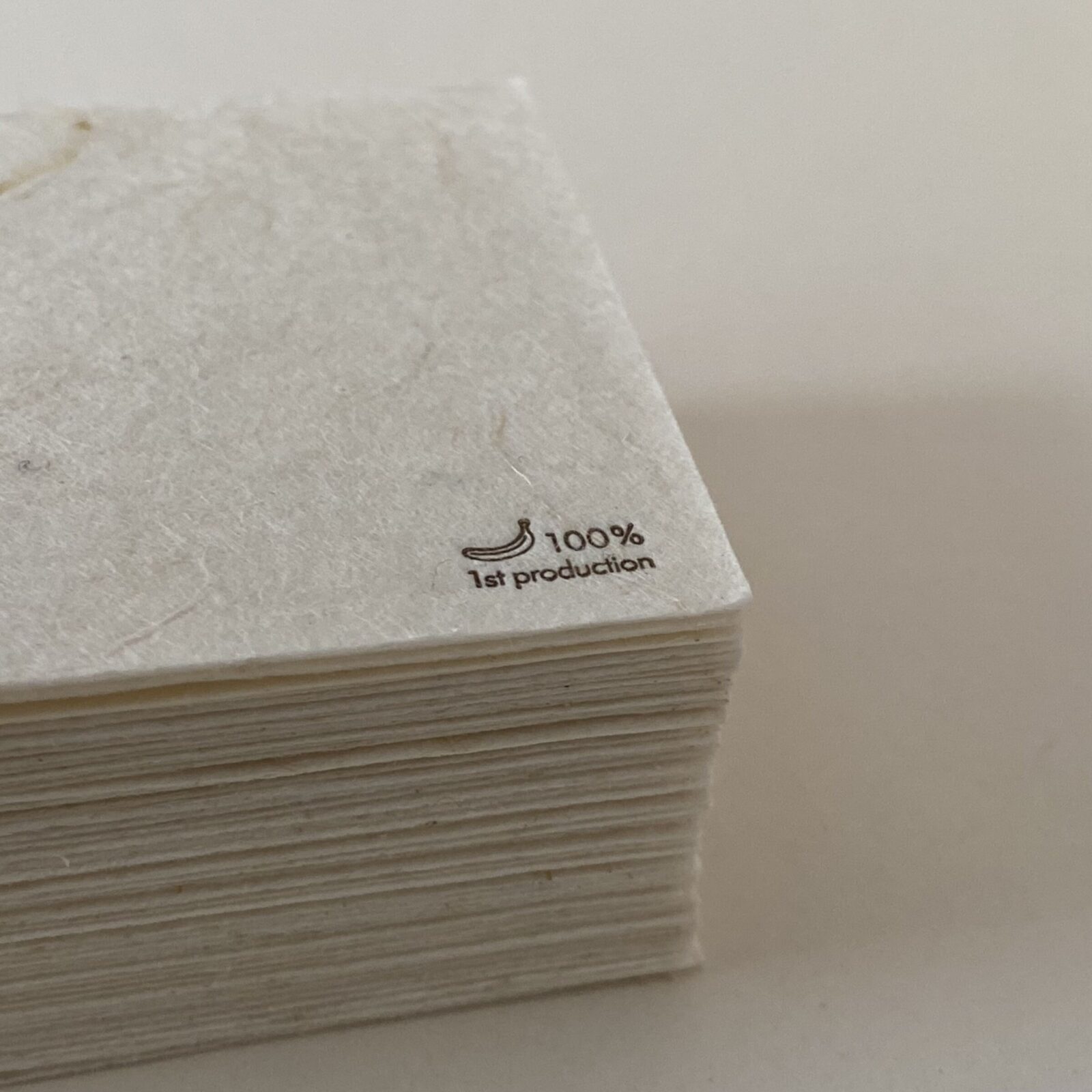 記念すべき、1回目の販売のため、今回初出荷する製品には100%バナナペーパーと第1号製品の証である「1st production」の文字を入れ、名刺サイズにして販売。