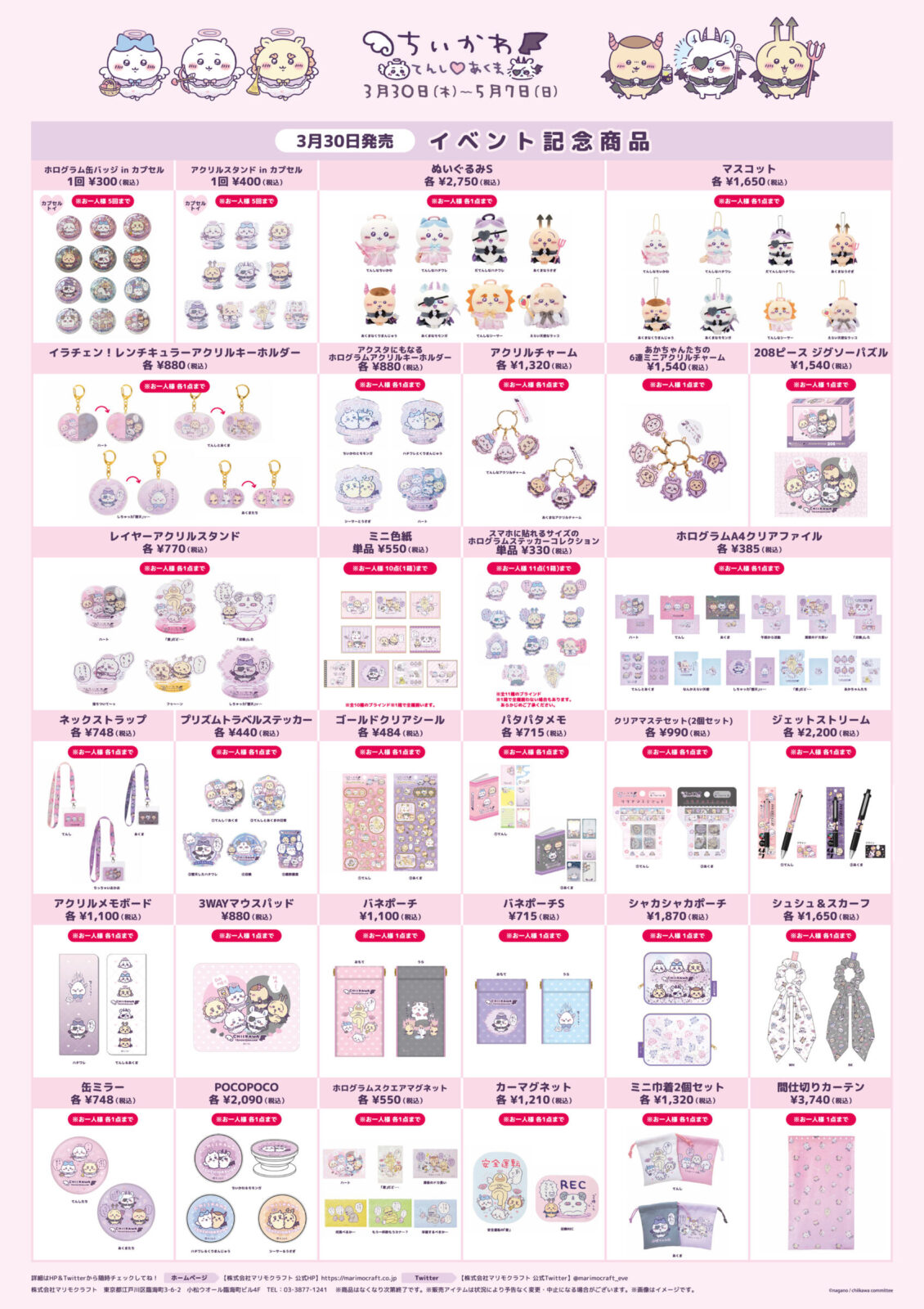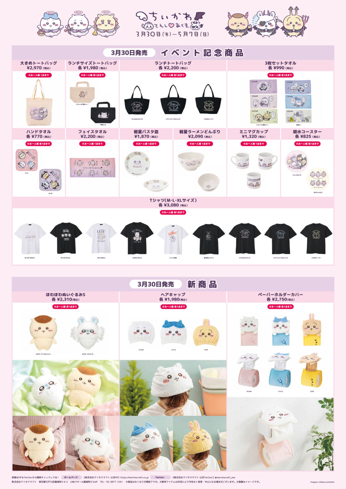 ※最新情報は「ちいかわ公式総合情報サイト「ちいかわインフォ」 ちいかわ てんし♥あくま 特設ページ」もしくは「マリモクラフト イベント用Twitterアカウント」をご覧ください。