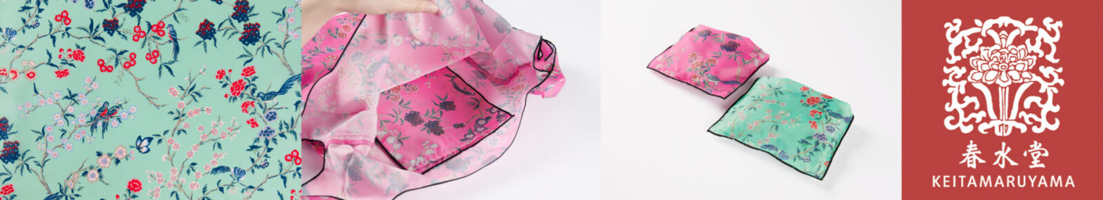 全面プリントされた花鳥柄は、華やかかつ主張が強すぎない可愛らしさで、春水堂の雰囲気を線蜜に表現されています。