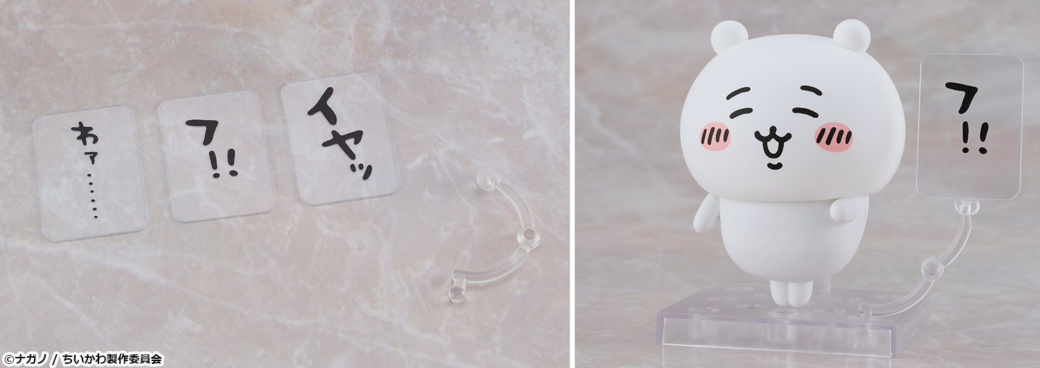オプションパーツには、お馴染みの「にっこり顔」や「ってコト!?顔」「フゥン顔」などちいかわたちの独特な表情が忠実に再現されています。