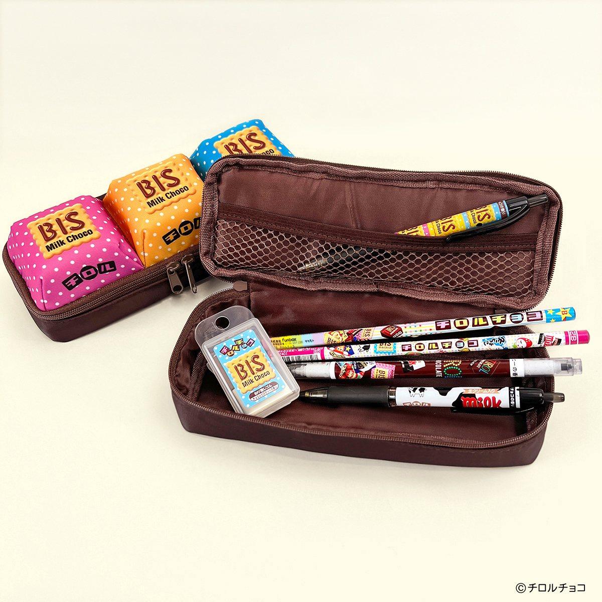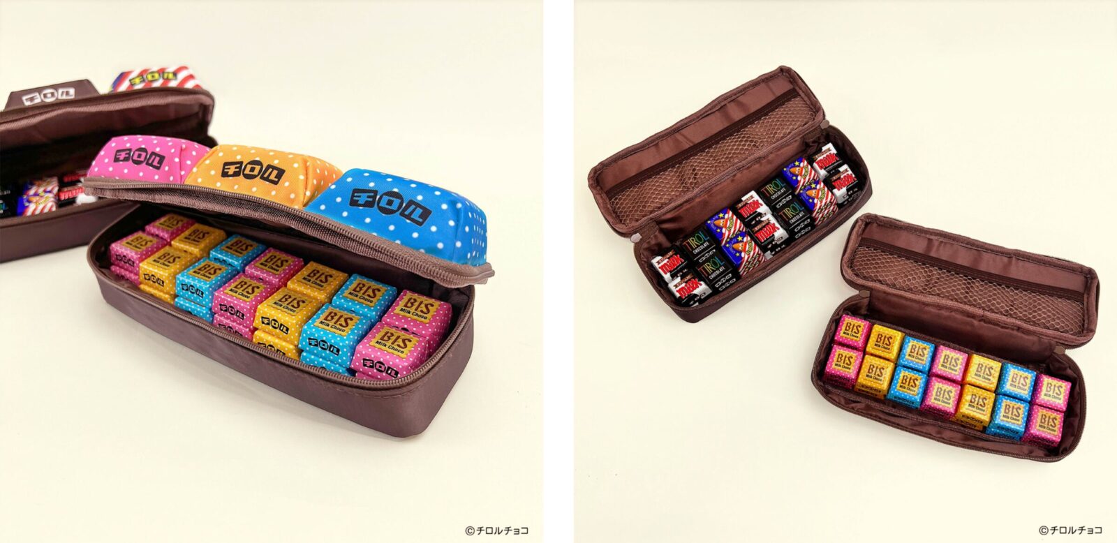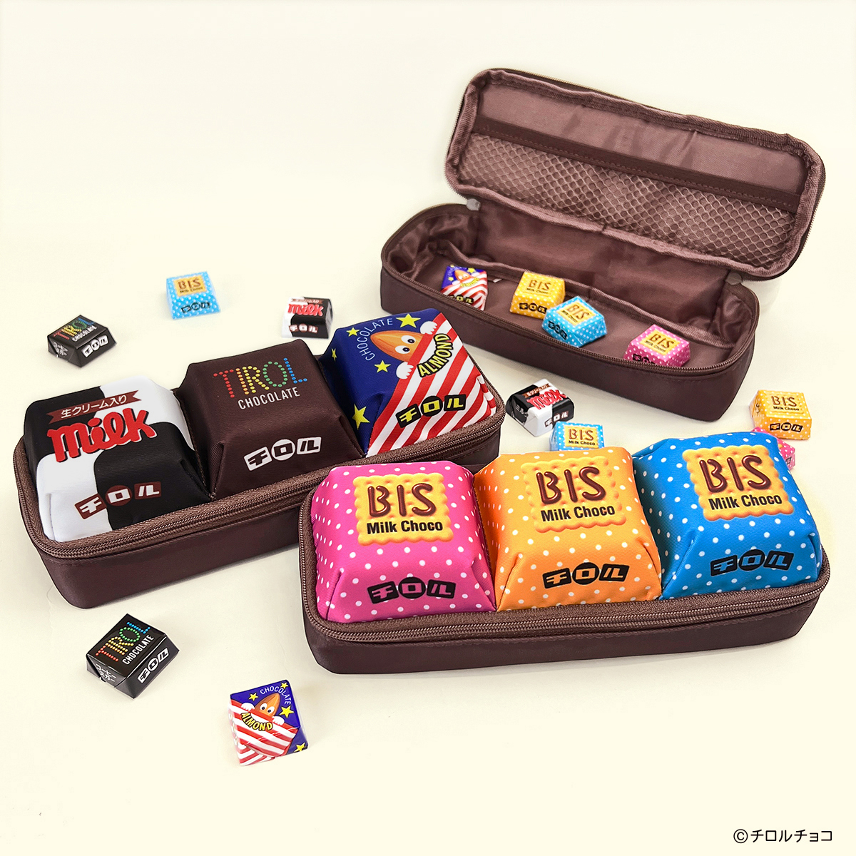 ペンポーチ上部分に3つ並んだ、約6.5cm角の巨大化したチロルチョコは本物さながらのビジュアルにするため、色味だけでなく側面の傾斜もこだわって制作されたようです。