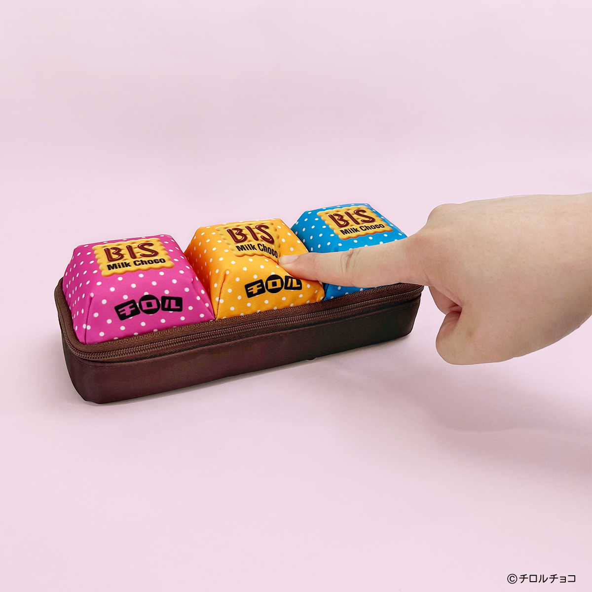このペンケースの大部分を占めるのは、幅が約6.5cmもある、3つの大きなチロルチョコ。側面の傾斜角度も、本物に近づけるため調整を重ねました。さらに、このチロルチョコの部分は柔らかい素材でできており、ついつい“ふにふに”したくなる感触になっています。