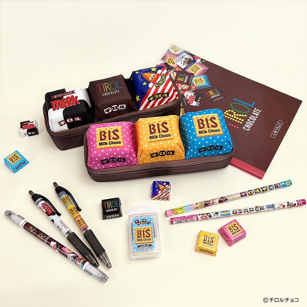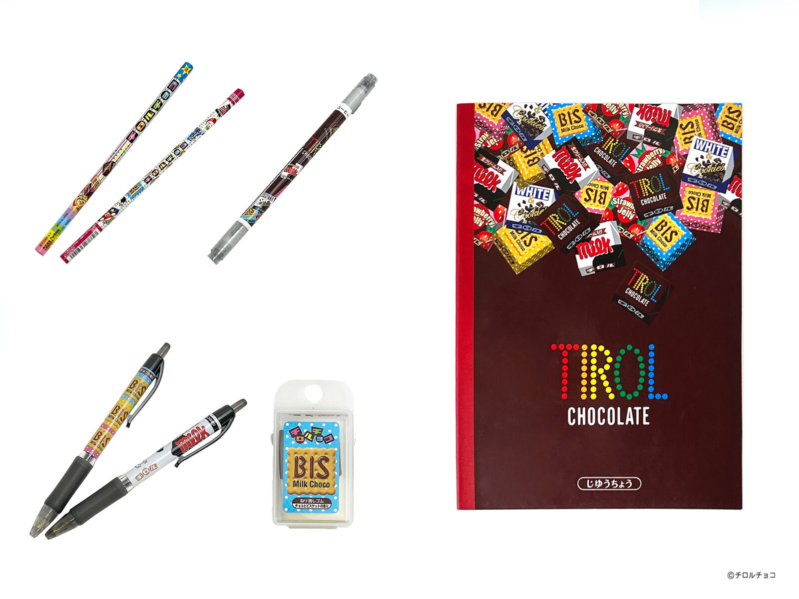 ペンポーチ以外にも、チロルチョコをモチーフにした香り付きのペン、鉛筆、自由帳等の文具を販売中です。Shop チロルチョコ、全国の文具・雑貨専門店、ファンシーショップ、オンラインショップ等でお買い求めいただけます。新商品のペンポーチとおそろいにするのもおすすめです。※商品の入荷・販売状況は店舗によって異なります。あらかじめご了承ください。