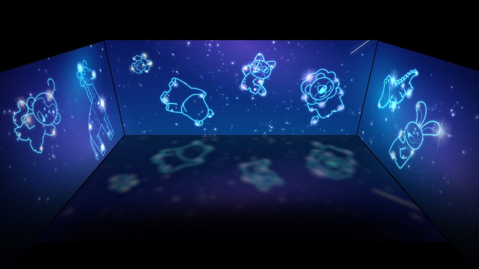 360°に広がったプロジェクションマッピングに、ネオン調や星座風に描かれたキラキラ輝く「たべっ子どうぶつ」のどうぶつたちが登場し、「たべっ子どうぶつ」の世界に没入する新たな体験をお楽しみいただけます。