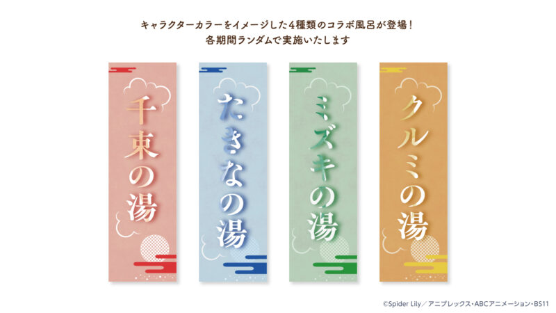 キャラクターカラーをイメージした4種類のコラボ風呂が登場し、浴室には特別にデザインしたタペストリーを装飾します。各店舗の開催スケジュールはTVアニメ『リコリス・リコイル』×極楽湯・RAKU SPAコラボHPをご確認ください。