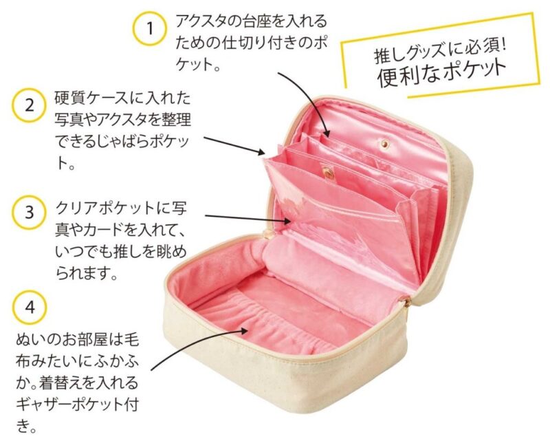 ぬいや写真やアクスタなどの推し活グッズをまとめて持ち歩くことのできる仕様になって