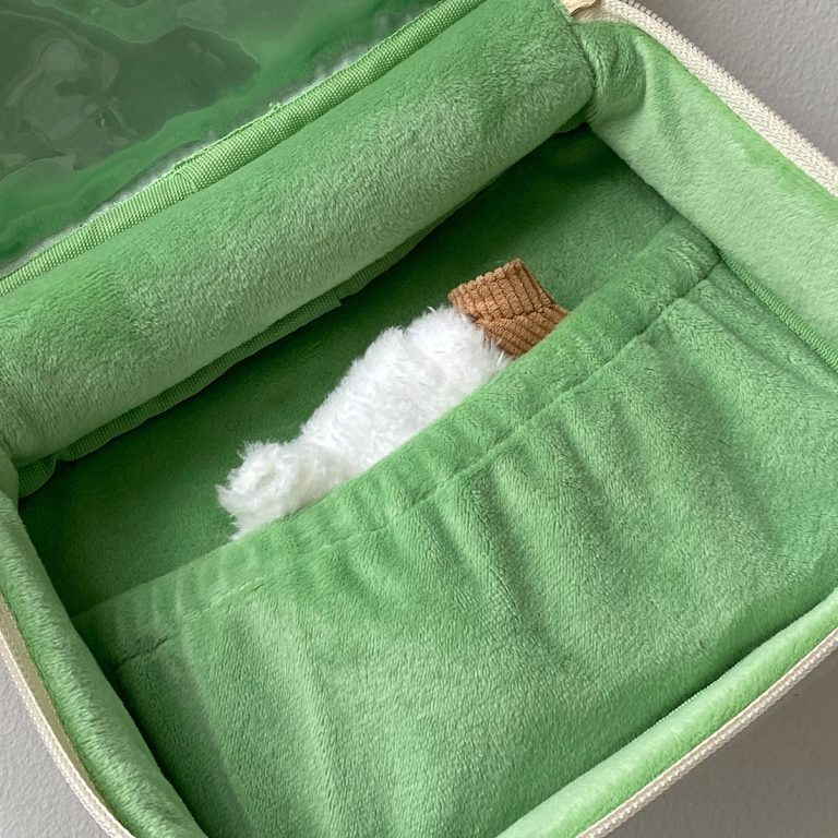 ぬいを入れるスペースは、大切なぬいのベッドのようにしたいと、さわり心地のよいふわふわ素材で仕立ててあり、底面にはギャザーポケット付きで、ぬいのお着替えや撮影用の小道具などを入れられます。底面にはギャザーポケットを付け、ぬいの衣装や撮影用の小道具などを入れられるようにしています。
