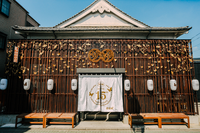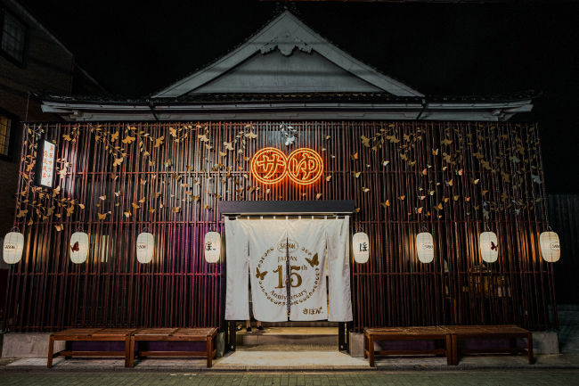 コラボレーションのスペシャルロゴと日本上陸15周年を配した暖簾、さらにオリジナル提灯が、秋の夕闇に温かな明かりを灯します。