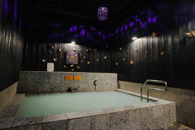 堀田湯名物の露天風呂では、日本の影絵の手法を用いた蝶が舞う空間にて、心も体も癒されるリラックスタイムを演出します。