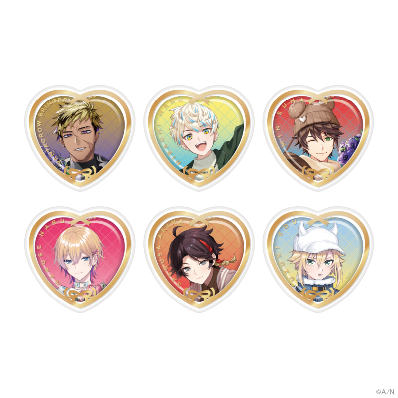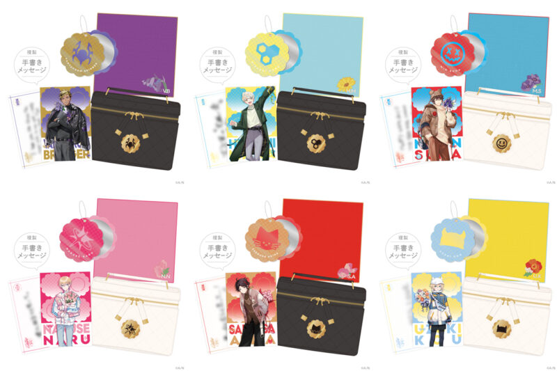 ラインナップは、ランダムチェキ風カード、アクリルスタンド、メタルキーホルダー、ハート型缶バッジ&カバーセット、スライドアクリルミラー、ミニハンカチタオル、複製メッセージ入りポストカードとバニティポーチがセットになったギフトセットの計5種類。