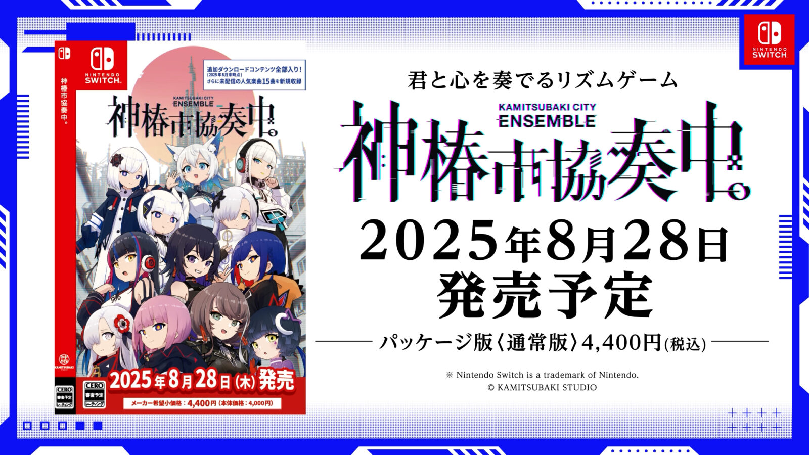 KAMITSUBAKI STUDIOは、君と心を奏でるリズムゲーム『神椿市協奏中。』のNintendo Switchパッケージ版が2025年8月28日(木)に発売されます。2025年7月から放送開始のTVアニメ『神椿市建設中。』の楽曲も収録されており、リズムゲームで遊ぶことができます。
