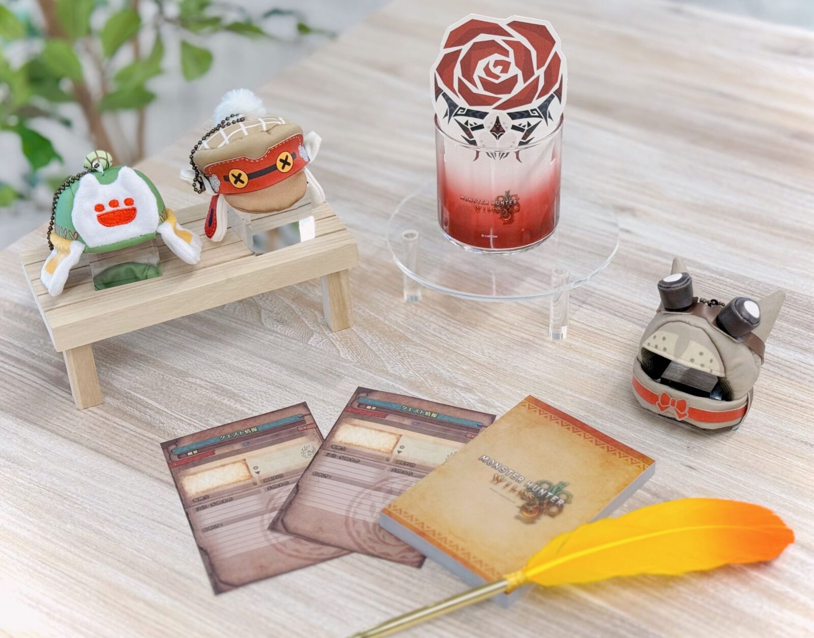 あのオトモアイルーの装備がキュートなマスコットになって登場!他にも「クエストカウンターメモ帳」はゲーム内でお馴染みのクエスト受注画面デザインとなっており、クエスト風にメッセージを残すことができる代物となっています。