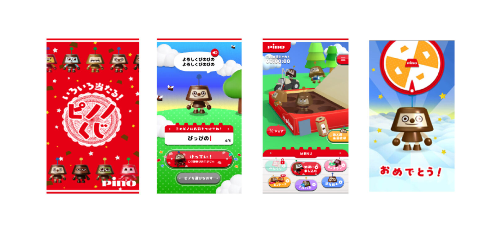 このキャンペーンでは、「ピノノくじ」限定パッケージに付いているQRコードを読み取ると、自分だけのキャラクター「ピノキャラ」を作ることができます。そのキャラクターを使って参加できる抽選会「ピノノくじ」では、オリジナルグッズが当たるチャンスがあり、毎週金曜日に当選発表が行われます。さらに、抽選結果を待つ間は、生成した「ピノキャラ」たちが集まる仮想空間「ピノタウン」で遊ぶこともできます。
